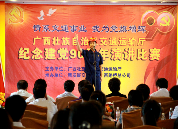 6月10日上午,由集團公司承辦的全區(qū)交通運輸系統(tǒng)慶祝建黨90周年“情系交通事業(yè),我為黨旗增輝”演講比賽在南寧舉行。自治區(qū)交通運輸廳副廳長梁毅、副巡視員黃小幸、廳長助理劉昕等領(lǐng)導(dǎo),廳直屬單位的領(lǐng)導(dǎo)及觀眾共350人到現(xiàn)場觀看比賽。自治區(qū)直屬企事業(yè)工會副主任陳元滾、自治區(qū)直屬機關(guān)工委組織部部長李祖循等領(lǐng)導(dǎo)應(yīng)邀參加。來自廳直屬單位共23位選手參加了此次比賽。