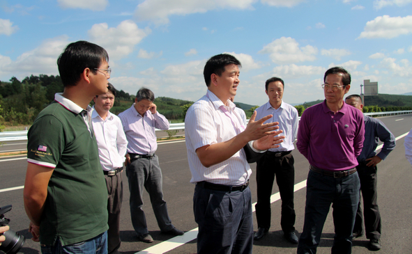 圖1:自治區(qū)交通運輸廳廳長潘?。ㄗ蠖┱J(rèn)真聽取項目相關(guān)負(fù)責(zé)人介紹項目建設(shè)情況,集團(tuán)公司董事長朱堅和(右三)陪同檢查。