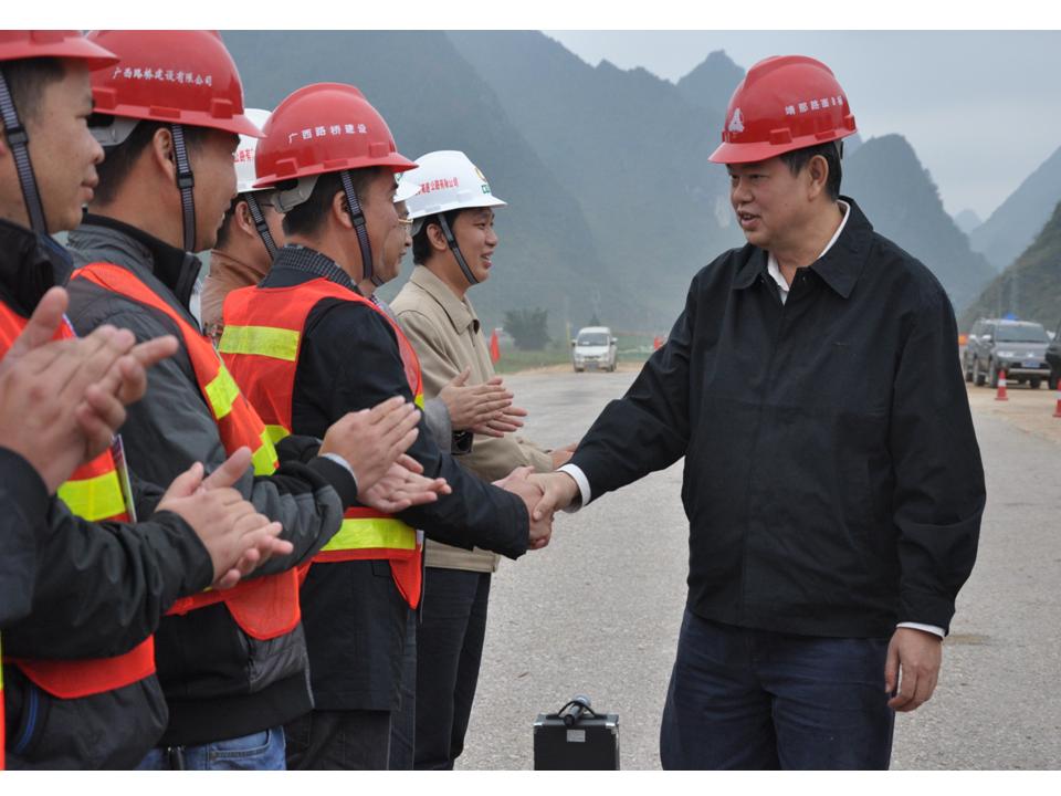 11月22日至23日,自治區(qū)交通運輸廳廳長潘巍、副廳長梁毅分別蒞臨廣西路建公司靖那路、欽崇路、玉鐵路等項目檢查調(diào)研,了解項目旱季施工情況,親切慰問奮戰(zhàn)在施工一線的廣大員工,要求各項目把握好有利時機(jī),堅決打贏旱季攻堅戰(zhàn),以優(yōu)異的成績促進(jìn)交通建設(shè)發(fā)展。