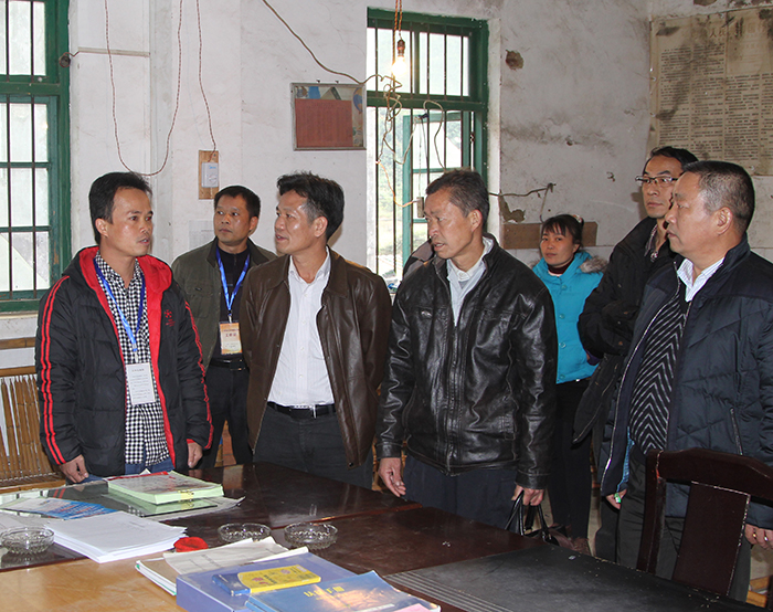 集團(tuán)公司朱堅和董事長(左三)、張友坐副書記(右一)聽取駐村”第一書記“梁義寬匯報工作。 在相堯村、豹山村、才帛村,朱堅和董事長分別與當(dāng)?shù)劓?zhèn)、村干部以及覃獻(xiàn)康、梁義寬、蔣博三位派駐農(nóng)村“第一書記”和扶貧工作隊隊員進(jìn)行親切交談,詳細(xì)詢問“第一書記”工作、生活情況,并聽取了“第一書記”關(guān)于幫扶村的黨建及村集體經(jīng)濟(jì)發(fā)展情況匯報。得知目前各駐村書記及扶貧工作隊員已經(jīng)完成精準(zhǔn)扶貧入戶摸底調(diào)查時,朱堅和董事長對“第一書記”到村以來,深入調(diào)查走訪,積極幫助村里理思路、定規(guī)劃、辦實事,表示充分肯定。
