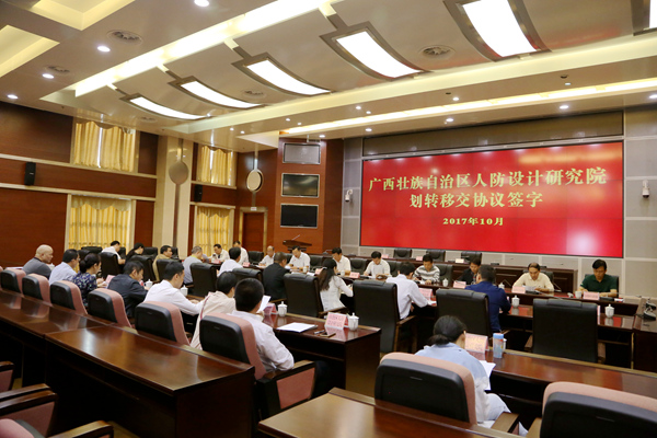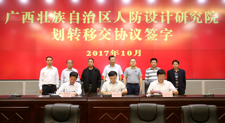 10月30日上午9時,自治區(qū)國資委、自治區(qū)人防辦及廣西新發(fā)展交通集團(tuán)有限公司在自治區(qū)人防辦應(yīng)急指揮中心舉行廣西壯族自治區(qū)人防設(shè)計研究院劃轉(zhuǎn)移交協(xié)議簽字儀式,標(biāo)志著自治區(qū)人防設(shè)計院正式與自治區(qū)人防辦脫鉤,成建制劃轉(zhuǎn)移交新發(fā)展集團(tuán)管理。集團(tuán)公司黨委書記、董事長朱堅和,黨委副書記、副董事長、總經(jīng)理唐咸秋,黨委副書記、董事、工會主席張友坐及集團(tuán)公司辦公室、投資改革發(fā)展部、人力資源部、黨群工作部、法律事務(wù)部等部門主要負(fù)責(zé)人參加簽字儀式。
