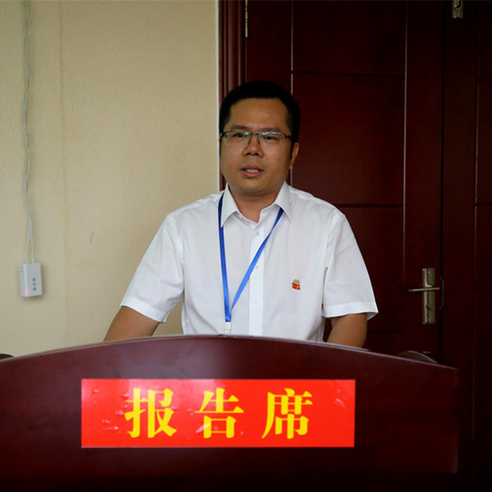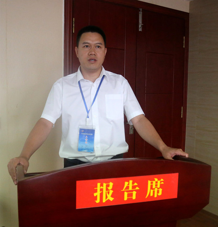 圖二:新恒通公司黨委副書記、副董事長、總經(jīng)理、總工程師藍(lán)日彥在本部站為活動(dòng)致辭