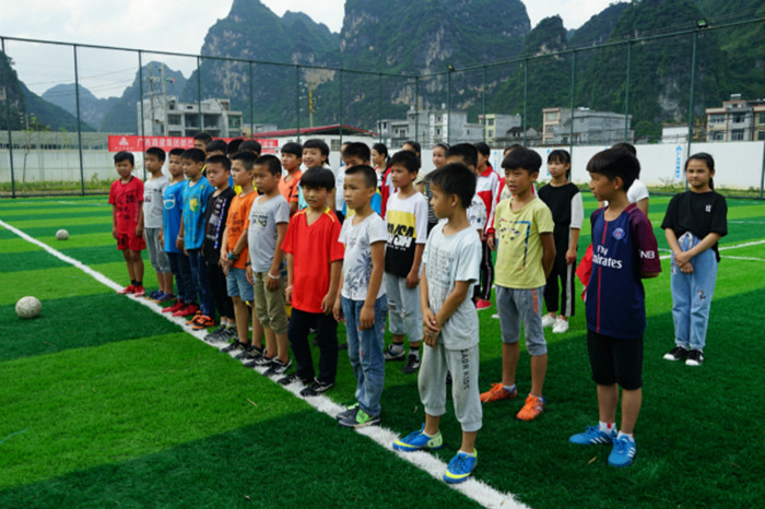 據(jù)了解,該小學(xué)的足球訓(xùn)練場地是一塊簡單硬化后的水泥地,不僅不符合正規(guī)場地尺寸標(biāo)準(zhǔn),堅硬粗糙的地面也大大增加了孩子們受傷的風(fēng)險。了解到這樣的情況后,都巴高速志愿者服務(wù)分隊策劃了此次聯(lián)誼,并決定為孩子們無償開放距學(xué)校很近的都巴高速二分部足球場,為他們提供更好的運動條件,讓分部駐地里的這片綠茵場成為六也鄉(xiāng)中心小學(xué)足球隊的訓(xùn)練基地,與孩子們共享足球運動的快樂。